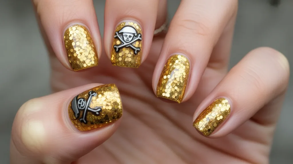 Gold glitter nails paired with pirate charms give that “treasure chest freshly opened” shine.
