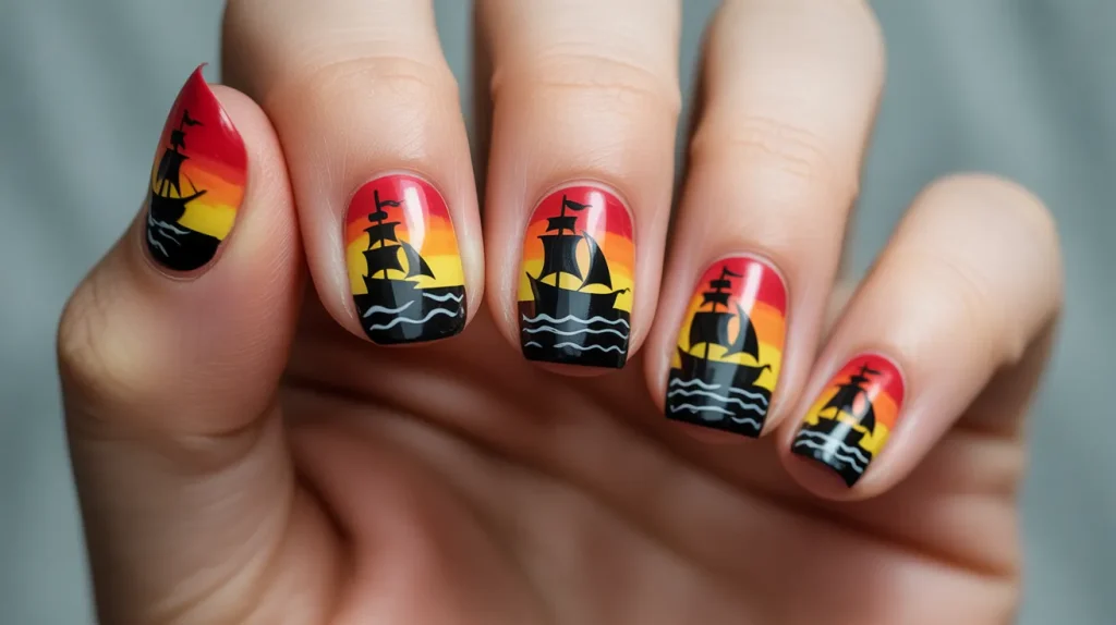 Black ship silhouettes sailing across a sunset gradient make your nails look like moving artwork.