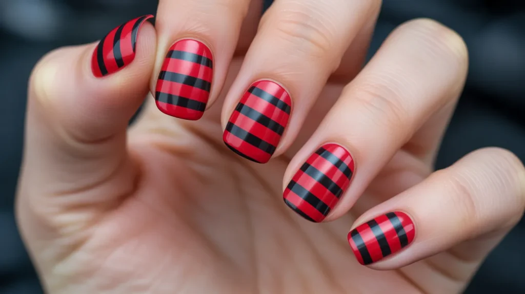 Classic pirate shirt-inspired stripes for a bold and easy Halloween manicure.