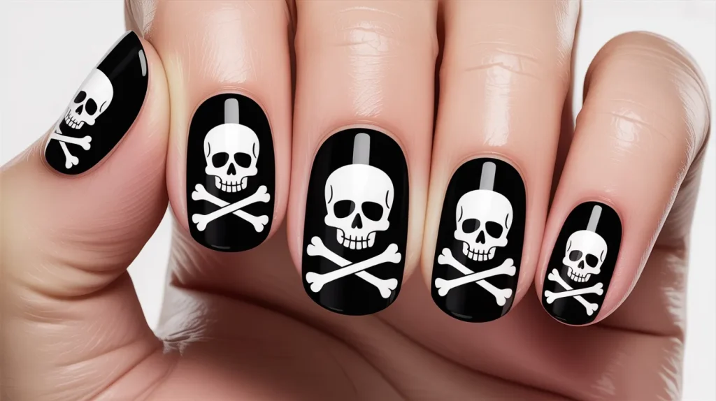 A black base with a white skull and crossbones, giving your nails the ultimate pirate flag look.