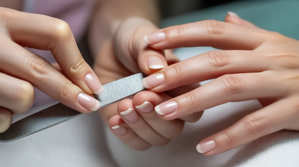 Shape your nails with a fine file and lightly buff the surface. This helps the polish grip your nail evenly. Avoid filing back and forth, as it can weaken your nails. Instead, file in one direction to keep the edges strong and prevent cracks that lead to chipping.